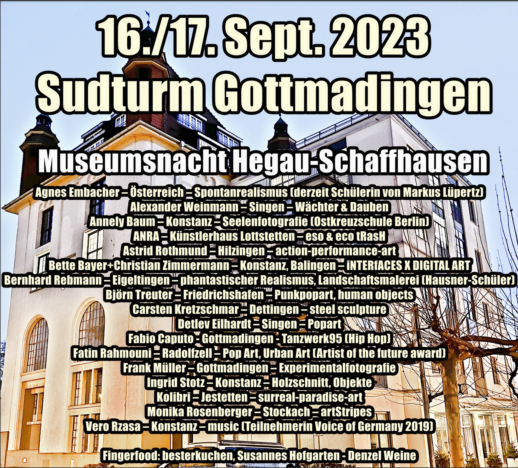 Der Sudturm, 1912 erbaut, war bis 1995 im Besitz der Bilger-Brauerei. Als Ruine 2001 von der Familie Diller erworben, erstrahlt das Gebäude nun weit sichtbar über die Dächer von Gottmadingen. Hier sollen in Zukunft Tradition, Innovation, Kunst und Kreativität nicht nur das Leben der örtlichen Stadtgemeinschaft bereichern. Anlässlich der Museumsnacht 2023 präsentieren 18 Künstler aus dem In- und Ausland ihre Arbeiten in unterschiedlichsten Disziplinen. Vielfalt ist hier nicht zusammenhangslos, sondern eine Komposition zahlreicher Möglichkeiten. Die Malerei auf Leinwand als klassisches Medium erfährt eine Bereicherung, in dem sie in Fraktale zerfällt und sich in ihrer Form stählern, skulptural, plastisch, digital oder in einer Performance offenbart. Alt und Neu sucht trotz offensichtlicher Differenz eine Brücke zwischen den Generationen: Der Zusammenprall, das Spannungsfeld als Kunst-Spielplatz.